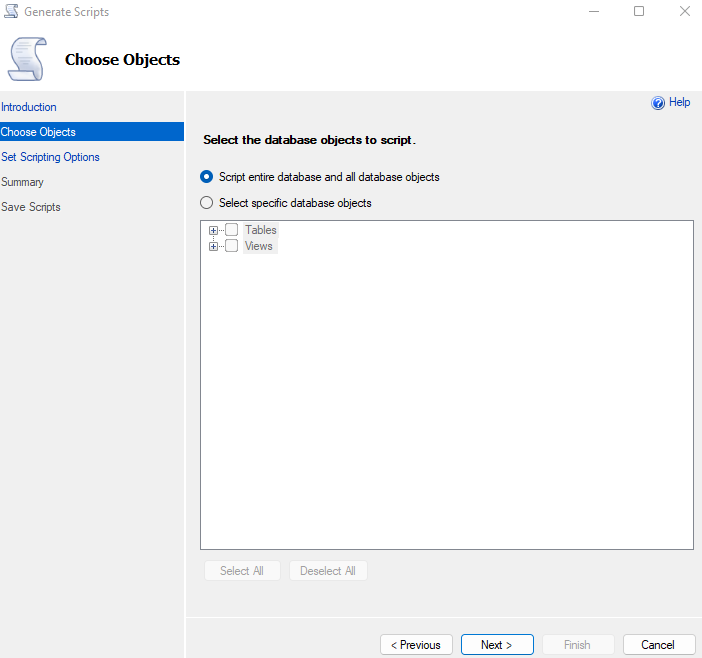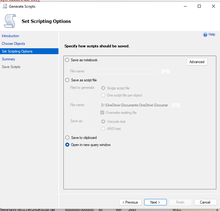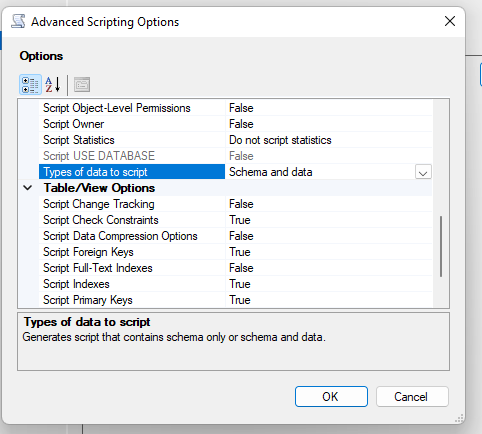 Select the scripting options. If you want to include the data, go to “Advanced”